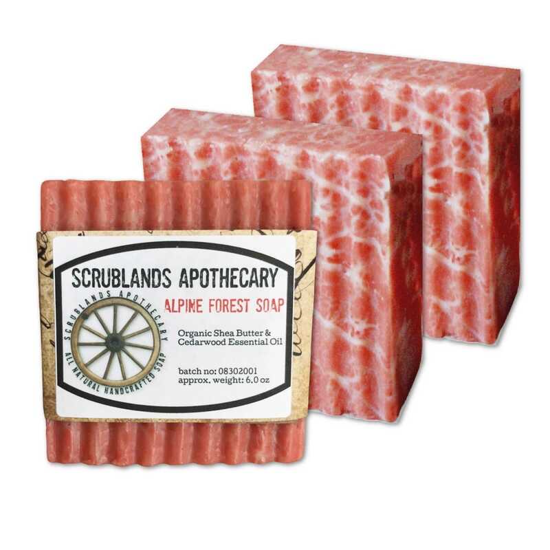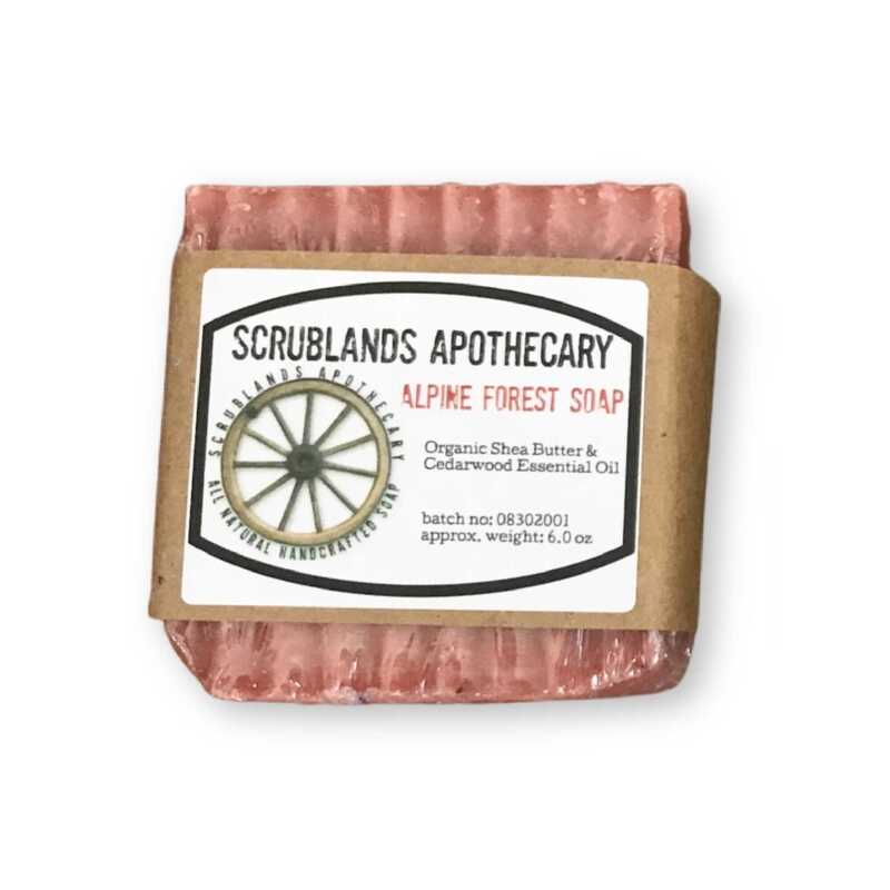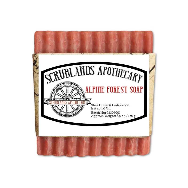 Alpine Forest Soap is cold process soap that is all-natural, handcrafted soap designed to cleanse and nourish all skin types. Alpine Forest Soap is infused with Unrefined Yellow Shea Butter to promote healthy, soft, and silky-smooth skin. Scrublands Apothecary uses two ounces of Unrefined Yellow Shea Butter per pound of soap. Cedarwood Essential Oil is added to the mix to help clean and soothe the skin. The cold process soap making method is used to create a dense, long lasting soap bar that locks in the aroma of the essential oils. All Scrublands Apothecary Soap is cold process soap made in the backcountry of North Carolina. Scrublands Apothecary will guarantee you are %100 satisfied with your purchase or your money back.